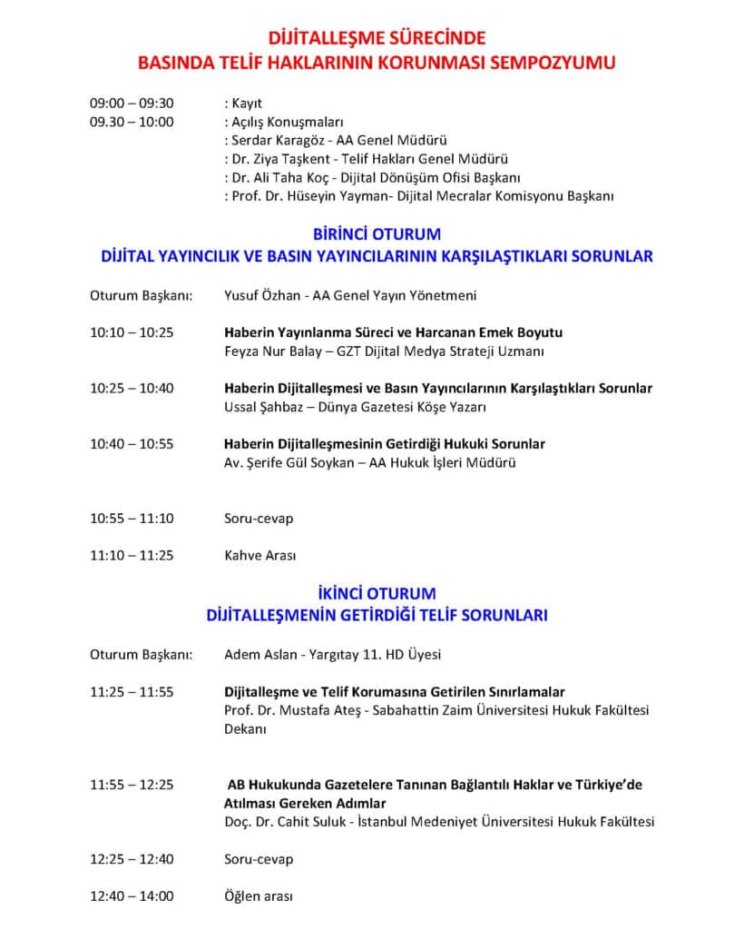 Haber içeriklerinin telifini korumak ve kamuoyunda bir bilinç oluşturmak adına Anadolu Ajansı’nın ev sahipliğinde 14 Ekim 2022 tarihinde Anadolu Ajansı Genel Müdürlüğü’nde “Dijitalleşme Sürecinde Basında Telif Haklarının Korunması” konulu sempozyum düzenlenecektir.