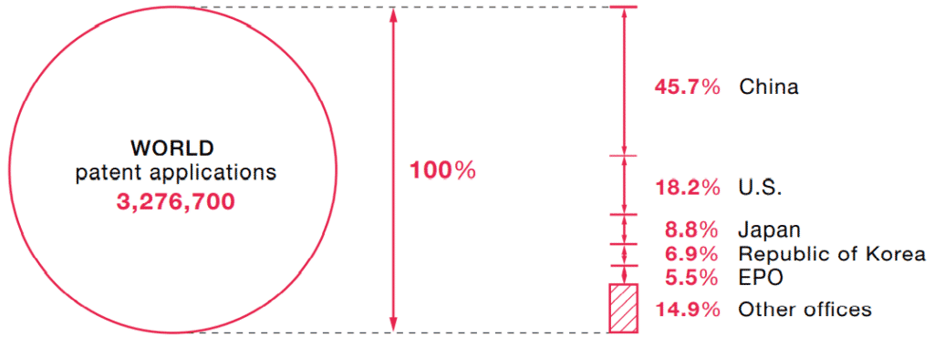 WIPO’ya göre 2020 yılında globalde bir önceki yıla kıyasla %1.6 artışla 3.3 milyon patent, %28 artışla da 3 milyon adet faydalı model başvurusu yapıldı.