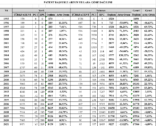 Türk Patent ve Marka Kurumunun (Türk Patent) patent başvuru istatistikleri ise yıllara göre şöyle (https://www.turkpatent.gov.tr/TURKPATENT/statistics/ );